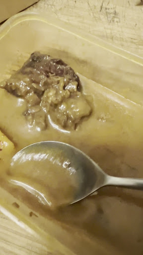 A dish in a plastic container with sauce in it I think it deserve for a paper bag to cover it especially when customer paid for over $120.