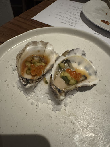It has an open kitchen, which is quite interesting to watch, but unfortunately, the cooking fumes spread heavily into the dining area. The strong, smoky smell from stir-frying can be overwhelming, often making you want to cough. The odor also sticks to your clothes. I’d recommend that kitchen staff wear masks to avoid inhaling too much smoke, as it could have negative health effects. The restaurant should also take more care in managing ventilation. As for the food, it was disappointing. Regardless of the price, almost every dish fell short. While the menu offers a mix of Asian and Western fusion dishes, the flavors are over-adjusted, either too sweet or too salty, with many dishes losing the fresh taste of the ingredients. First, the oysters were topped with a mix of onions, vinegar, and salty fish roe, which completely overwhelmed the natural taste of the oysters. Also, the cold appetizer wasn't served as the first dish; we had finished two other appetizers before the oysters arrived. We ordered a shrimp and scallop sandwich and roasted chicken wings as side dishes. Unfortunately, the sandwich was overcooked, causing the shrimp and scallops to lose their texture, and the wings were too salty. After finishing the appetizers, we waited at least 30 minutes for the next course. For the main course, we chose the beef ribs, which were overcooked and became stringy, almost like jerky. Even with the tangy sauce, the overwhelming sweetness of the meat couldn’t be masked. I would not recommend this dish at all. We also ordered stir-fried green beans. We specifically asked for it not to be spicy, but the dish initially came with chili. After informing the staff, they separated the chili and nuts. This dish was the only one that tasted reasonably balanced and normal, without being too salty or sweet. We also ordered crispy duck, which took an entire hour to arrive. By 9 PM, we had finished most of our meal, and were still waiting for this dish well into 10 PM. During this wait, we tried to speak to the staff, but they seemed too busy or just ignored us. Finally, when we decided to cancel the dish and asked for the bill, a staff member came over to check. The manager then informed us that the duck had been out of stock earlier but was now available and asked if we still wanted it. The lack of communication and poor service attitude were unacceptable. When an ingredient is unavailable, the staff should inform customers immediately and offer alternatives, rather than making them wait over an hour and then surprise them with availability. Our entire dining experience lasted almost 2.5 hours, with about 70 minutes of waiting. During that time, the staff rarely refilled our water, and although I understand they were busy, they could have left a water bottle on the table for us to refill ourselves.
