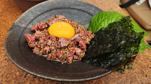 The food was okay. 1.Miso eggplant was as expected, just a deep-fried eggplant with miso flavour. $7 a stick Angus flank was tart, it missed on elevating the flavour with either shisho/perilla to elevate the dish I felt. $28 crab omelette, reminded me of a home made omelette with tinned crab and deep fried topping of tofu skin and Vermont curry. I liked it but wasn't blown away. $32 The fried soy rice. It was just a simple korean style bimbimbap for $15 The Angus striploin. This was the only excellent item. The soy and olive sauce base was terrific and the wasabi/horse radish/mustard/ponzu elements all complemented well. The only thing that I thought was well made. $50