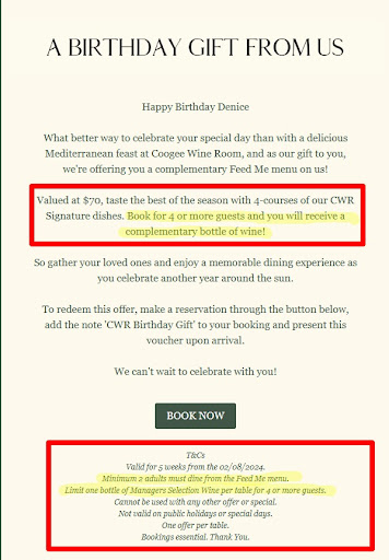 Your Booking Confirmation email only states "Terms & Conditions Apply.", no specific details. Your response to organiser's query about "..a marketing rip=off ploy..." states "The CWR birthday offer.....birthday person eats for free.Yes, the other diners need to pay for their meals,..." CONTRADICTS T&C's, only 2 must dine.