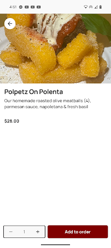 The home made polpetz on polenta was very good. The house made olive "meetballs" were delightful paired perfectly with the sauce.