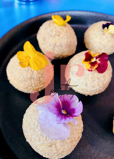 Doesn’t look like much from the outside but as you step in, you’re welcomed in with rustic pink brick walls, rich blue couches, tables and gold chairs. Portraits of the people of India. A gorgeous back bar. It's just a beautiful venue overall with even more beautiful food to match.