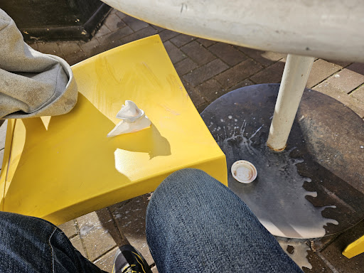 I sat in the outdoor area and I ordered a small hot chocolate and bacon and egg roll. Food came quickly, which was nice. Then after some time I was wondering why my coffee hadn't arrived, that was when I saw my coat and my bag on the chair got super wet, I was like oh no. Did the umbrella have a hole or something? And then I glanced at the floor, there was a paper cup on the ground, completely upside down. Liquid was everywhere. It was my hot chocolate.
