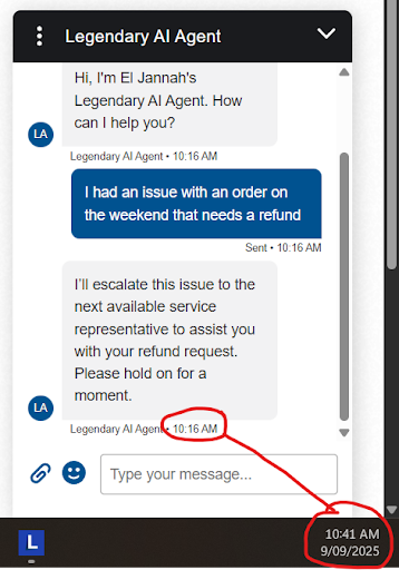 We didn't have time to drive back to the restaurant to get the missing item so I tried contacting El Jannah to at least get the missing item refunded. There is no phone number or email address to contact the restaurant or head office, so I used their online feedback form. The automated reply advised me to use their Live Chat to resolve this. I've now tried their live chat 3 times and have waited 20+ minutes each time before giving up. There is no option to 'stay in the queue' for them to call or follow up later. As I sit here typing this feedback waiting for a human agent to respond on the Live Chat, it's now ticked over 26 minutes and still waiting. All I'm after is a simple refund for a missing item without having to drive back to the restaurant during our busy week.