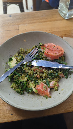 Sandwiches, salads and coffee in a light-filled venue with rustic furniture and a relaxed vibe.