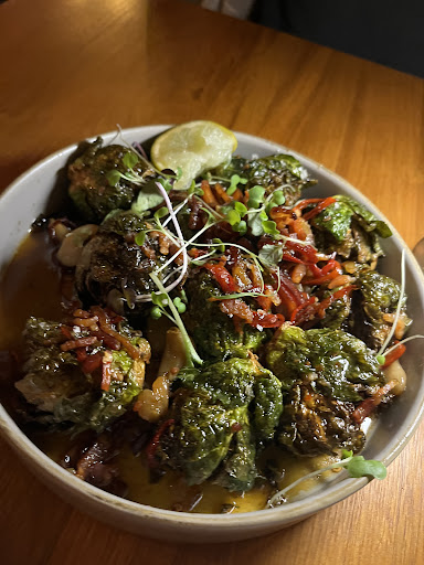 We had originally planned to go on a Saturday night and forgot to book and was fully booked by 5pm!! Excited to go we booked for the next day (Sunday) at 7pm. We arrived to a moderately busy restaurant, the exterior was absolutely gorgeous, straight out of a storybook. The fairy lights were a cute touch and the atmosphere was lovely. We were seated at a gorgeous window booth, although sad we couldnât see much outside, we imagined at lunchtime it would be a very picturesque place to sit. We were originally served by a lovely man who took us to our seat and explained the menu wonderfully, also mentioning the specials of the night and what he recommends. Another lovely waitress then took our order; Eletos Mexican street corn ribs, Twice cooked potato, Fried Brussel sprouts, and the Kilcoy black diamond beef strip loin. The Brussel sprouts came first after only 5 minutes! What an amazing flavour mix; sweet, spicy, a bit sour and salty! The outside of the Brussel sprouts was nice and charred which was a great touch, and the salty add of bacon was a great touch. Was a little bit salty by the end, we got through our bottle of water in 5mins but would definitely order again. The corn ribs, potato and steak all came out 5-10min after the Brussel sprouts which was a bit overwhelming but nice to have something to go with the steak. The steak was a bit undercooked and the middle of the steak was quite chewy and grissly but was overall tasty. We expected the twice cooked potato to be crispy, but rather was very soft inside and had a little bit of crisp on some of them, we couldnât taste the nori and the truffle oil was very subtle (which we liked!), it went nicely with the steak. The corn ribs were fabulous, although the mayonnaise/sour cream sauce on top was unexpected. The actual corn was delicious, so crispy and the spices were amazing. I personally didnât enjoy the sauce as I am not a mayonnaise loving person but a little bit was enjoyable, would order again with sauce on side. The special dessert of soft serve with roasted apple and dark rum butterscotch sounded incredible but was sadly disappointing. It came with the strange white chocolate balls on top which we didnât think added anything special, the soft serve wasnât very âsoftâ rather icy and like sorbet, although the flavour was light and nice. I had falsely assumed the apple was hot and was told by our kind waiter that the apple is roasted and then cooled as to not melt the ice-cream which makes sense but was a bit disappointing. Although it was our mistake, and my partner still finished it off, the waiter was very kind in our misunderstanding and gracefully took it off our bill!! The cocktails were divine, we strongly recommend the Thirst Trap (tequila, chili, lemon and passion fruit), we ended up ordering another! We would...