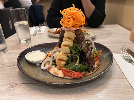 Read morel Visited this place recently and found the experience somewhat underwhelming, especially considering the price. We ordered skewers for $40, which included four small pieces - the lamb was decent, but the chicken was just okay - served on flat pita bread accompanied by a modest salad and a small serving of tzatziki sauce. Unfortunately, the only utensil provided was a blunt butter knife, which was impractical for cutting. Notably missing were the usual sides one might expect at a Greek restaurant.