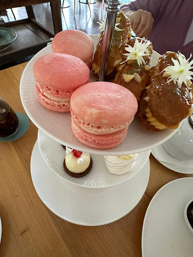 Staff here work to their own rhythm and are not easily dissuaded. This saw our tiered platters of sweets and savouries arrive before our tea orders were even taken. Lucky the trio of finger sandwichesâbested by egg, chive and watercressâwerenât so dry as to leave us parched! While service lagged, the kitchen did a lovely job with savouries. The tiny mushroom brioche bun and the tomato tarte tatin being standouts in the eating. Passed separately from the platter, salmon rillettes smeared onto long thin crackers, were an enjoyable way to begin.
