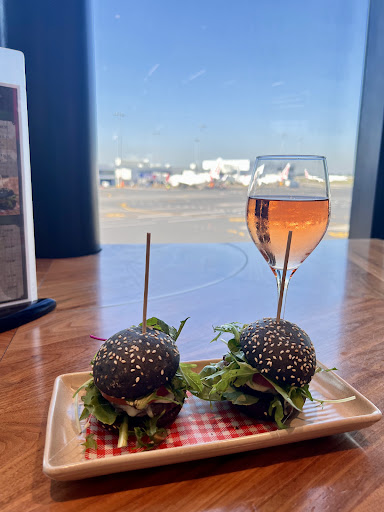 I ordered the black bun sliders (mini burgers with black sesame buns), and they were surprisingly delicious! The buns were soft, the filling was juicy, and the fresh greens added a nice crunch. Paired it with a glass of rosé wine—light, refreshing, and just perfect for a relaxing pre-flight moment.
