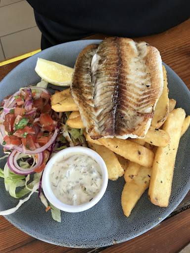 The fried barra and chips were flavored very well. Chips were seasoned really well and the tartare sauce was really special.