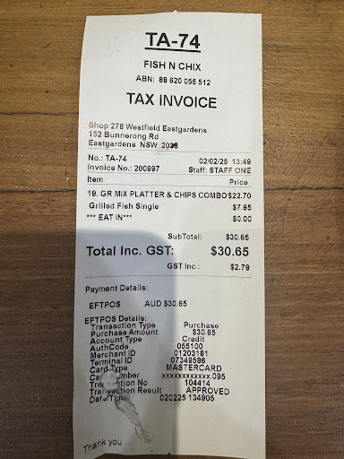 Read moreI had a really disappointing experience at Fish & Chix Eastgardens. I ordered a mix platter and an extra fish fillet, expecting a decent meal with reasonable service. However, we were only given one tiny tartare sauce for the entire meal for two people.