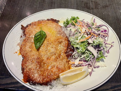 I had the chicken parmigiana ($35) The chicken was huge, the sugo rich and delicious and cheese melted to perfection. The coleslaw with kale was creamy and tasty. I was so full at the end I wasn't even sad about lack of chippies or other carbs. Not sure what the lemon wedge was for.