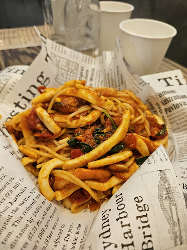 Read moreSuperb food, reasonably priced and perfect for a quick take away bite or to sit and watch the drama of the night unfold. There were lots of Uber bike couriers around for people wanting food delivered and there was a steady stream of orders going out, which is always a good sign. I had the spaghetti marinara and a coke (other colas are available but not here!) which came to 23 bucks which is just over a tenner if, like me, you're from the UK. The food came quickly and in a paper box/plate with a wooden fork. The pasta was cooked just right and there was plenty of delicious sauce with a good helping seafood i.e. prawns, crab & squid. I was having bit of trouble getting all of the sauce onto the small fork when it occurred to me to get some Garlic Bread to mop it all up. This turned out to be an inspired choice because the GB was sublime and perfectly suited to the task. They were more like twisted doughy strips and soaked up the sauce beautifully. I'm here for a couple of days so I may...