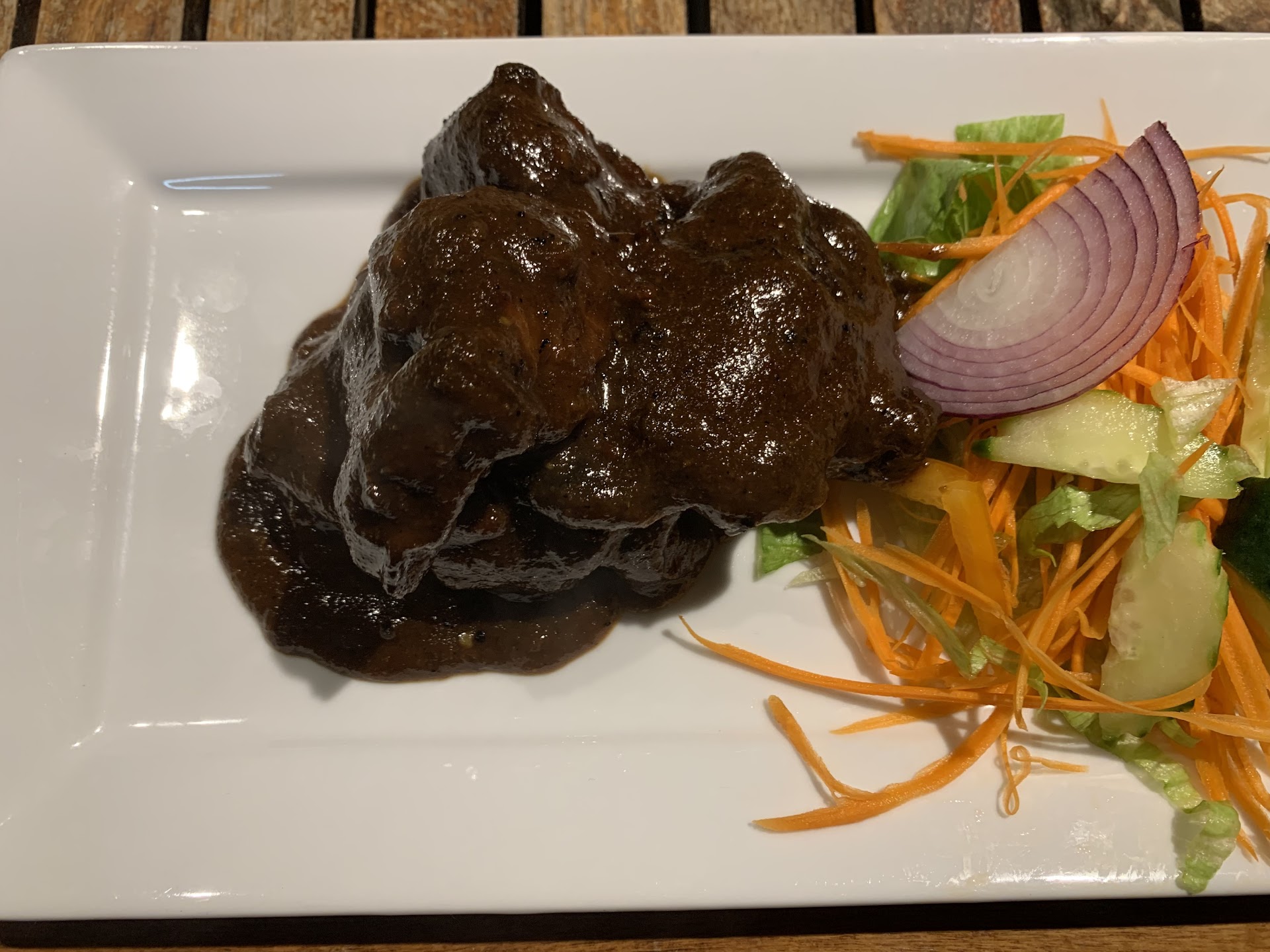 The whole fish was fried without any kind of breading and we loved it. Cooked to perfection, with the exterior nicely browned and inside the white flesh still juicy and tender. It matched well with the red, smokey, and well seasoned Jollof Rice which was deliciously spicey, but not hot. Jollof Rice is such comfort food and a treat when done well and this was exactly that. There was a type of tomato and onion based sambal on the side to have with it. Sweet, tasty and seasoned well. The mixed vegetables were sautĂŠed and still had that nice firm bite which keeps the flavour.