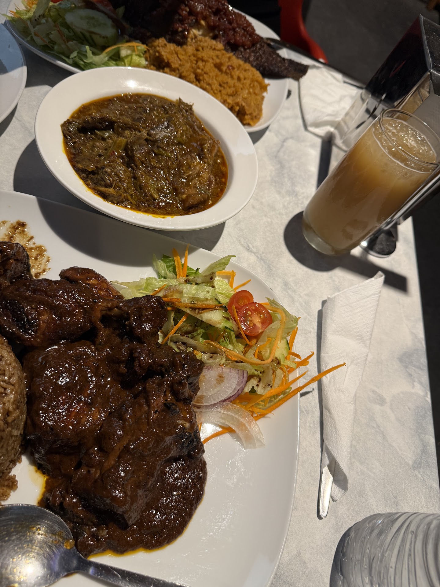 We started with some strong-hit gingerbeer and mio mio, a steamed bean pudding that has a delightful crab/crustacean taste. Then we moved on to spiced suya meat served on a sizzling plate and a couple of mains. The jerk chicken came most recommended by Abu. The sauce is a bit sweeter than a version I once tried in NYC, but the chicken's nice. My favorite two dishes here were the egusi and the cassava leaves. Shout out to West Africa and their incredible stews. Lots of spices, lots of flavors, and golly they're good! Personally wasn't huge on the fufu here though, which tasted wholemeal-ish. I much preferred slopping the egusi over the jollof rice even though it might not be traditional. We ordered some fried fish too (thumbs up) and Attacker, a cassava couscous from Sierra Leone! The serving size of the mains is huge, and hence all are appropriately priced at $30+. All could feed 2 or more each. We didn't follow that suggestion when we ordered though