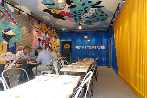 Up here at the big end of town, Gami Chicken & Beerâs dĂ©cor is slightly fancier, with a soaring entry and green wall under the skylights that let you view the tower above. A communal table sits under dangling repurposed wood and a cluster of naked Edison bulbs. The rest of the space has the trademark blue and yellow corrugated iron and a long street-art style mural by Brolga that continues up onto the ceiling. Even when seated in the lower-ceiling rear, the whole effect is bright, airy and colourful, aided by a sunny young floor team who seem genuinely interested when they ask if you liked your meal.