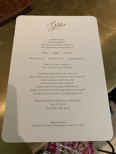 Busting out the best Basque cheesecake ($19) I’ve tried—after a not inconsiderable amount of lockdown sampling—shows chef Lennox Hastie (Firedoor) knows how to wrap up an excellent dining proposition. Gildas unites the Fink Group’s (Bennelong, Quay and Otto) restaurant expertise and Hastie’s culinary vision in a buzzy Surry Hills corner store. While less formal than Firedoor, Gildas isn’t quite casual, but it let let you rock up unannounced to sip sherry and sup on Basque Country snacks. The namesake gilda ($6/each), with its anchovy, green olive and Basque green pepper, is a given to neatly strip the workday from your palate. Also in the pintxos, juicy pickle-topped skate brandade croquetas ($18/2) (that we accidentally managed to double) when we ordered two serves of excellent orange pimento bread served with a generous smear of smoked butter ($8/2 slices). It’s good for mopping up squid ink, which dominates cuttlefish, fennel and beans ($27) tucked under radicchio leaves. It’ll also work on the rock oyster cream underlying tasty retired dairy cow tartare ($28)—not that we ran out of potato chips.