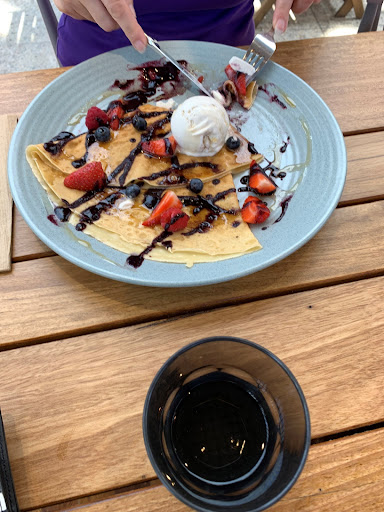 The Love Me Berry crepes are on the sweet portion of the menu, topped with seasonal berries, blueberry infused maple syrup and coconut ice cream.
