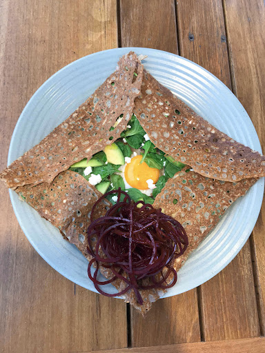 We went for the Veggie Patch crepes, which were beautifully made into a little pocket, with baby spinach, crumbled fetta, mushrooms, avocado and spiraled beetroot. We added a free range egg to this.