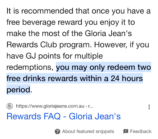 Been coming to this Gloria jeans for over a 2 years with my husband almost daily for our coffees, unfortunately due to staff not knowing the reward points policy I wasnât able to use my Gloria jeans rewards points for 2 coffees like I have in the past many and I repeat MANY times before at this Hoxton park store, and all of the other Gloria jeans stores with no problems, this really frustrated me today. I was told on this occasion by the staff member who served us at the drive thru that they donât do that and theyâre not allowed to, I told her Iâve done this here before many times, she then proceeded to ask another staff member who also gave the same reply, I also mentioned to her that Iâve done this many times asked for the owner, she then informed us he was her dad and he would say the same thing in a really rude standoff attitude. I told her she was incorrect and that you can do it, she then told me I was wrong and that itâs also a Gloria jeans company policy for only one coffee at a time, she wasnât havenât it, she didnât allow it and I was charged for both coffees. I didnât want to ruin the rest of my day so I let it go. BUT REALLY??? because clearly THERE in black and white on THE GLORIA JEANS website it states you are able to use your points for 2 drinks in a 24hour period. WHICH I repeat once again I have done many times in the past. WHICH I ALREADY KNEW. It wasnât a good experience here this time around which was quite sad as it made me feel like I wonât be returning back to this store with the attitude we received in...