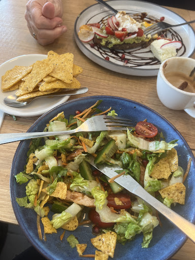 The coffee here is good, but the food and atmosphere left a lot to be desired. I ordered the chef's special, a fattoush salad, described on the menu as marinated grilled chicken, cos lettuce, pomegranate, tomato medley, crackers (which I thought might have been their interesting twist on the salad), and the chef’s special fattoush dressing. However, half the bowl was filled with corn chips instead of traditional crackers. When I asked the staff if this was correct, they just shrugged and said, 'crackers, corn chips.' I ended up removing half of them and breaking a few over the salad, hoping to get closer to a typical fattoush. I also noticed they’d forgotten the pomegranate, but when I asked, they did bring a small bowl of it for me to pour on top. Felt like a made my own salad in the end.