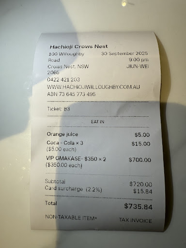 What actually happened: During the sushi course, the sushi we received was not only the same as the 150pp menu, but actually had fewer varieties than the 150pp guests next to us. Meanwhile, the five guests on our right who also ordered 350pp were served completely different and obviously higher-quality sushi. Before we raised any questions, the restaurant still expected us to pay 350pp with no explanation. It really felt like they assumed customers wouldn’t notice and could just be charged the higher price. When we asked, the chef’s attitude was extremely poor: • At first, he denied any difference and claimed that “omakase is decided freely by the chef each day, so it may vary among customers.” • I pointed out that it was the same day, same time, same price, yet our sushi was completely different from the other 350pp guests, and even worse than the 150pp guests. • Only after we kept pressing did the chef finally admit it was a “system issue, they didn’t see our 350pp booking, so they hadn’t prepared the 350pp ingredients.” • Throughout this, he was dismissive, evasive, and never offered a sincere apology — just excuses to blur his own mistake. Billing was even more unacceptable: • The chef verbally promised to charge only 100pp as an apology. • But at checkout, it suddenly became “100pp discount per person,” meaning we were charged 250pp. • In the end, we ate sushi that was worse than the 150pp menu, but were forced to pay 250pp.