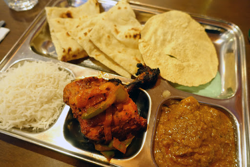 The Tandoori Chicken Thali ($19) is basic but covers all your lunch needs, spreading them across the compartments of a shiny, stainless-steel thali tray. Two smoky pieces of bone-in charred tandoori chook, served with green capsicum and long loops of onion, are complemented by a chicken curry of your choice. If you like heat, opt for the one labelled chicken curry rather than butter chicken. While it isnāt going to blow your head off, itās tasty with sweet sweated onions and whole cardamom rather than cream or coconut. Thereās also a soft and pliable naan sliced into quarters, rice and pappadums hiding frost green mint chutney thatās more yoghurt than it is mint.