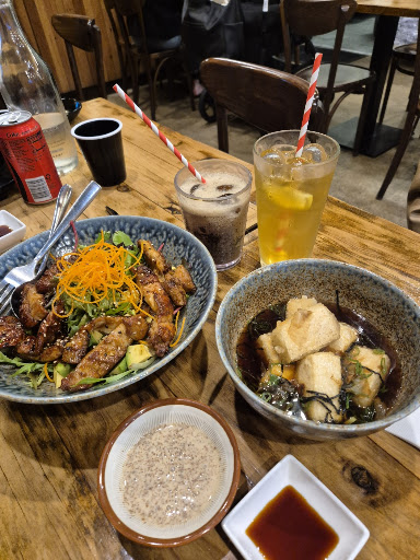 The ambience is warm and welcoming and comfortable. The space is well lit with warm lights and not overly bright. The music in the background is chillaxed and not too loud but just the right volume for an enjoyable time conversing with others or just eating alone.