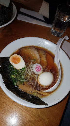 We ordered two pork buns, a bonito ramen and a grilled unagi don (rice bowl). The braised pork of the pork bun was nicely marinated and tasty but personally I thought there could be more topping accompanying the pork that would combine well with the flavors. The ramen was nice with chewy noodles and a broth that had a very strong bonito flavor. What didn't work out very well was the grilled unagi don. Although the rice was seasoned and flavorful it was either overcooked or cooked with too much water which made the rice soggy. The rice grain structure was nowhere to be found. The unagi tasted prepackaged and had a earthy flavor to it. The yellow radish and marinated greens that accompanied the rice was a nice touch but it didn't compensate the sogginess of the rice. When commenting on this to the staff they could only inform the kitchen about it and apologize because all they had was the soggy rice so they couldn't change anything about the dish.