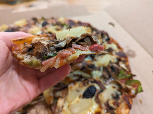 As for the pizza, it has potential but it has two odd textures that arenāt bad, but donāt necessarily suit pizza. It carries this creamy feeling in your mouth that I canāt tell is from the sauce or the cheese, whilst the base is a flakey/pita like bread.