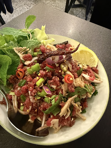 Dishes we tried: -Papaya Salad (Som Tum) – A perfect balance of spicy, sour, salty, and sweet. The shredded papaya was fresh and crunchy, topped with roasted peanuts for extra flavor. -Isaan Sausage – Grilled to perfection, crispy skin on the outside with a juicy, flavorful filling infused with herbs and spices. Best enjoyed with the spicy dipping sauce. -dried Beef (Neua Dad Deaw) – Tender and savory, with a slightly sweet and salty taste. Nicely fried without being too dry. -Grilled Ox tongue with Jaew Sauce – Smoky and tender pork slices served with a spicy, tangy dipping sauce that elevated the flavor. -Crispy Rice Salad (Yum Khao Tod) – The highlight of the meal. Crispy rice mixed with herbs, onions, and lime juice. Refreshing, flavorful, and a great balance to the grilled meats.