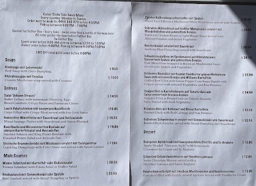 Unfortunately, I can not recommend Kaiser Stubn after our visit there this weekend (Saturday night). At 5.30pm we called and asked for a table for 5 and were told we could come at 7pm. Upon arrival, the table was not ready (the previous group hadnât left yet) and the restaurant was packed, no other table we could be seated at. So we were made to wait 15 minutes in the entrance, without being offered a drink. Once we finally got to our table, we had to wait 20 min to finally get some menus, after having to ask multiple times to get menus. There were only 3 waiters for a packed restaurant. As we got the food menus, we instantly ordered our drinks and entrees to avoid further waiting. We got our entrees about 30 min later. We ordered our mains around 7.45pm and they did not arrive at our table until 9pm, without an apology for the long wait. The mains were only luke warm. Whilst waiting such a long time for our mains, we had to chase waiters multiple times to order more drinks. Once we were done eating our mains and they cleared the table, we commented on the outrageous waiting time and only got a smirk from the waiter. No apology or acknowledgement. We left to pay and again mentioned to the owner that we were not happy with waiting 2 hours from when we had our table booked to eat our mains, no apologies again. With a booking for 7pm, we did not expect to get our mains at 9pm. Unfortunately not great customer service. It wouldnât have been such a bad night/ service, if the waiters& owner had acknowledged the long waiting time and apologised, or offered some snacks whilst waiting for mains/ pre-warned us that it...