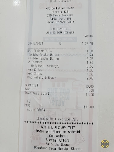 Read moreOrdered dinner through the KFC app on Saturday evening for my mother and child as I was out. The delivery guy was useless, didn't understand basic instructions on where my home was (Huge white gate, can't miss it) food was delivered to the wrong address even though I ticked the box for the food to be passed to someone, 90 minutes later I got a call from my mother saying the food wasn't delivered, when I called KFC Bankstown South the response was, sorry bro we didn't deliver the food, Door Dash did, can't help you, click............