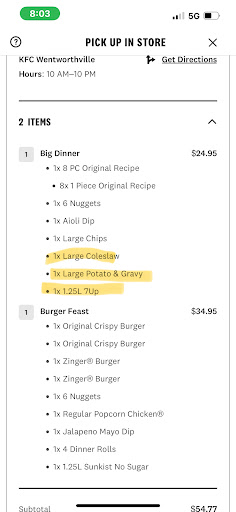 What about some Integrity when it comes to providing the consumer with what they paid for , for once. $38.95 for 10 pieces of chicken ( allegedly what you built this name on ) plus some dodgy sides. You would think you could at least get the chicken right. It's in your name , remember it was once called - KENTUCKY FRIED CHICKEN NOT budgie or small finch chicken....