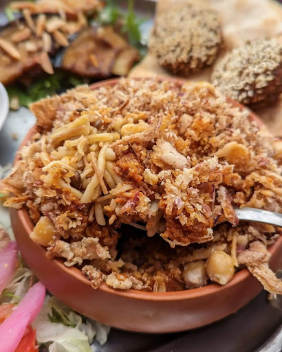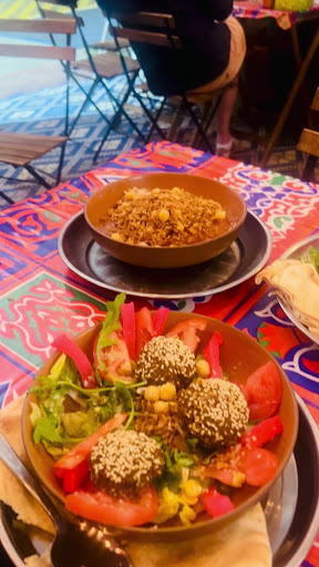 I ordered the koshari, which is the national dish of Egypt. It is a hearty and satisfying bowl of rice, lentils, pasta, chickpeas, tomato sauce, and crispy fried onions. The koshari was well-seasoned and had a nice balance of textures and flavors. The tomato sauce had a hint of vinegar that added a tangy kick to the dish. The fried onions were crunchy and savory, and added a contrast to the softness of the rice and pasta.