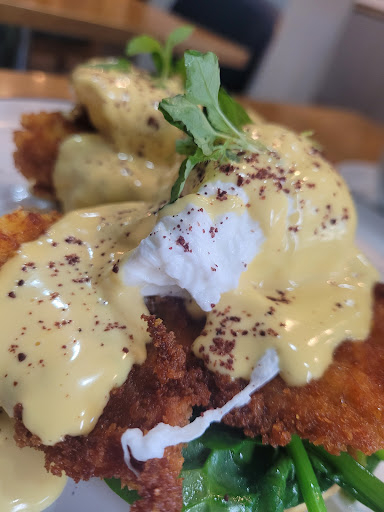 Ā Ā Ā Read moreYes! that's the world's first Chicken Shnitzel Eggs Bennidict. Crispy moist shnitty, runny egg, tasty tangy hollandaise sauce and fresh (not soggy) leafy greens. Get on it!
