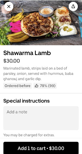 Read moreDishonest and misleading. I ordered the lamb shawarma plate, which looked amazing in the picture and description. What I received was completely different burnt meat and barely any sides, just a few pickles. It was missing almost everything shown and promised. When I contacted the restaurant, they claimed they hadnât updated the Uber Eats listing. Thatâs not my problem I paid for what was advertised. If youâre advertising a dish a certain way, you need to deliver that. Iâll be uploading photos of what I should have received vs. what I actually got. Very disappointed and wonât be ordering again. Untrustworthy and not worth the risk.