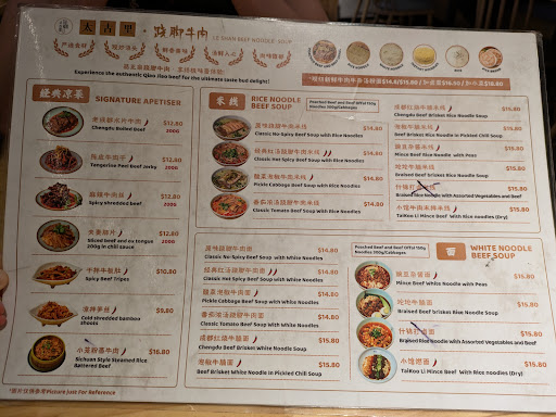 Read moreTo be honest,the signature beef noodle soup 跷脚牛肉米线 (it's in the restaurant name) was a bit underwhelming - the broth tastes like Lanzhou lamian minus the chilli oil to me, i.e. quite a plain, slightly salty beef broth. It comes with rice noodles, beef slices, beef tripe, coriander and green onions. What stole the show was the Taikoo Li mince beef noodles 小馆燃面! They come laden with lots of toppings (beef mince, toasted peanut crumbs, some kind of preserved vegetable, chilli flakes and coriander) - mix it up and it is a delicious flavour bomb with a nice variety of textures too - spicy but not overly so. The fuqifeipian 夫妻肺片 (sliced beef and ox tongue in chilli sauce) looks very red and intimidating but isn't that spicy! Quite flavourful as well - spicy, mala, sweet, salty, vinegary - signature Sichuan flavours. Their aircon was not on/working when we went and it was extremely hot and stuffy inside so not the best environment for chowing down on spicy food - hope they...