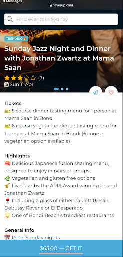 First time at Mama Saan, had heard good things about the joint and that atmosphere is great. Loved the decor, but aside from that, totally overrated! We went for the âSunday Jazz Night and Dinner with Jonathan Zwartzâ ($65pp), the only 2 dishes worth eating was the sashimi tacos and the edamame beans. The âgrilledâ sweet potato was actually raw, quite horrible to eat and canât believe they charge $7 for 4 uncooked slices of sweet potato and drizzle copious amounts of miso dressing on it to give it flavour and call it a âdishâ! Then the only main that comes out is the chilli chicken, which I canât eat (they said theyâll cater for me as Iâm pescatarian and serve me the vegan dishes instead). And when I inquired with the staff member, he tells me âthereâs celery there, why donât you have that? And thereâs rice?â So Iâm paying $65 to eat plain rice and celery? They bring out the miso eggplant, but thatâs it, which looked sad too. I was waiting for my main dish but my friend said it ainât coming, that was all we were getting! And also, it was not Jazz music that was being performed so misinformation right there. Might want to correct that.