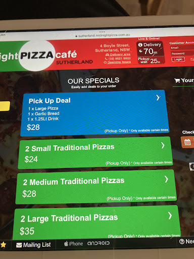 My family has been a loyal Midnight Pizza customer for 25 years now. The food we ordered tonight was absolutely disappointing, and the order wasnāt even correct. The website menu is incorrect, with many of the things being discontinued. The portion sizes have significantly decreased. One meal wasnāt even packed in, two of the pizzas were stone cold, when we got there to pick up the order, they said that they were out of prawns, instead of calling back and explaining. While this was going on, the rest of the food just sat waiting on the bench. And to top it off, the pasta I ordered came with cheese already topped with cheese when delivered, rather than kept side in container. I can be hospitalised for eating dairy products, so that was also not pleasant either. First time Iāve ever had that from not only this place but from any restaurant. What restaurant puts the cheese on prior ? ?