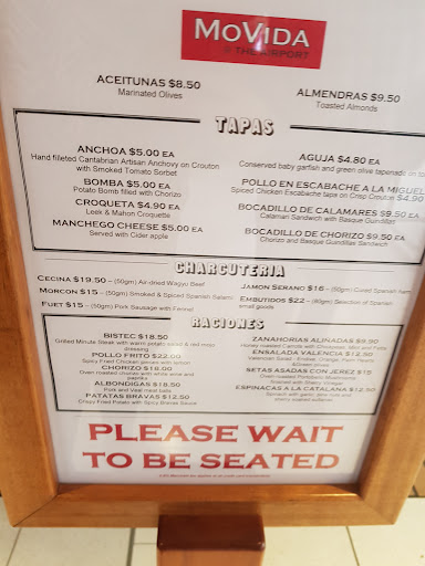 Movida serves the kind of Spanish food that really lends itself to servicing the time-pressured demands of people eating inside a busy airport. This style of eating means you can order a couple of things to get started, and order more as you go along, eliminating the need to speed-eat your food if your flight starts to board. While it’s a reasonably simple fit-out, with blonde wood tables and black banquettes, terracotta floor tiles and dimmer lighting, it still provides some respite from the over-lit, fluorescent white terminal.