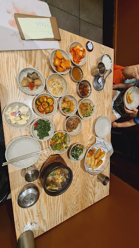 Ā Ā Ā Read moreWhat a feast! Korean food is just wonderful. There are some negative, one star reviews on here, please ignore those. The service is friendly, the wait times are reasonable and the food arrives in a timely manner. The days of a price for white devils and a price for Koreans are long gone. We were lucky enough to share a similar feast in downtown Seoul, and the food at Myeongdong was just as good. Certainly the Banchan (side dishes) were numerous and tasty. From the cubes of acorn jelly to the kimchi to the mushed up tofu to the mountain greens Korean cuisine is ingenious for the way it uses left overs. The TtEok beoki was delicious, although the addition of gyoza (fried dumplings) felt a little out of place. The seafood pancake delectable and the croquettes delicious, although I don't know you can go too far wrong with deep frying mashed potato and seafood. We had the fried chicken (more fried stuff, I know, right!) soy flavoured and delicious, but I'll try the snow cheese next time. We ate a lot, but I doubt you'd come away from this restaurant feeling hungry. Cass beer (Korean, of course) and Raspberry Rice Wine were a real treat. Coveted the clay dishes and hoped they were for sale, but sadly they weren't. Probably not a great idea for a restaurant to sell its limited number of plates, especially when they need so many per group. Hard to fault this restaurant --- perhaps a bit more Korean paraphernalia on the walls? King Sejong's Hunmin Jeong-eum, for example. Loved the...