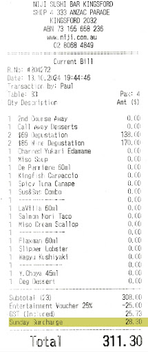 Just a note: there is an additional 10% surcharge for dining on Sundays. 15% on...