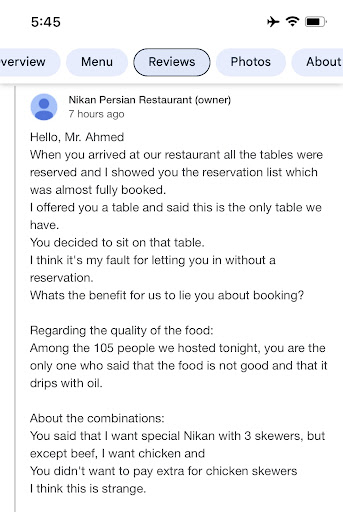 I regret to say that my recent experience at Nikan Persian Restaurant was extremely disappointing, to say the least. Despite having been loyal customers for numerous visits, the treatment we received during our visit last night was utterly unacceptable.