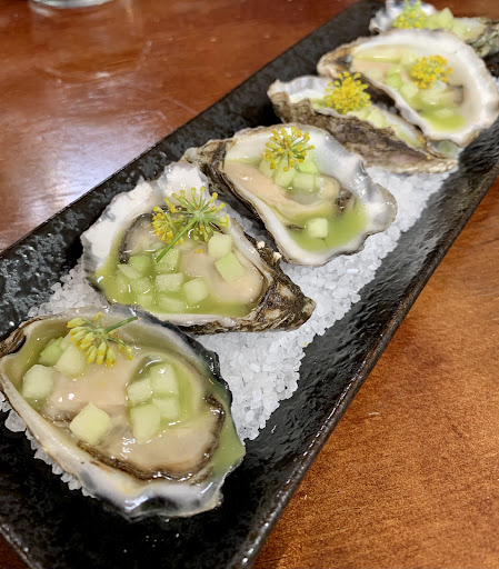 We opted to sip sake at our table while we chose our wine. The Karakuchi ($9/glass) is fruity and dry junmai sake, while the Takashimisu ($10/glass) junmai daiginjo offers crisp apple with a savory, umami finish. The globe-trotting one-page wine list is quite wide ranging for its size. I settled on a blush pink 2016 Wooing Tree ‘Blondie’ Blanc de Noir ($90/bottle). This unusual ‘white’ pinot noir is created by minimal skin contact before pressing the grapes, and results in a pretty wine where pink grapefruit mingles with the smell of freshly baked brioche.