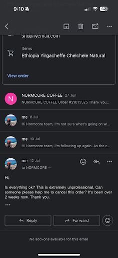 Read moreMade 2 online orders in the last 3 months and NONE of them have been fulfilled. I have tried emailing, messaging via Instagram, and sent multiple messages via their online web chat - not a single response. Starting to think this company is sham. Having read other customers experiences, this company should really be reported to NSW Fair Trading. So disappointing. I feel completely ripped off. I wouldn't recommend anyone go near this company. Plenty of other legitimate coffee bean suppliers out there that won't fleece you of your hard...