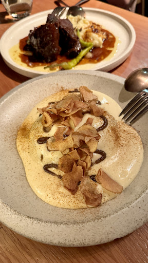 I came to NOUR on the 18th of July 2025, at around 6:30PM. For entrées, I had 2 Abrolhos scallops with burnt butter, and a half portion of the beetroot and sheep’s curd. The scallops were delectable; they were cooked to a proper doneness, and the butter wasn’t overpoweringly rich. I wasn’t sure what I was meant to be tasting with it being ‘burnt butter’, but I found it no hinderance. My other entrée was, if I recall what the waiter said correctly, thinly sliced beetroot pressed into a sheet, and wrapped around a sheep’s curd cream with a pomegranate sauce. It wasn’t what I was expecting, but the concept was definitely interesting to say the least. I’m not entirely sure if I would order it again; it was delicious, but also not a highlight. For a main I had the lamb neck with their house pita breads. This was a solid recommendation from one of the bar staff, and I thoroughly enjoyed this dish. The lamb meat was tender with a crispy exterior, and the yoghurt sauce complemented the subtle Middle Eastern flavours without being an overbearing presence. The pita was dense and fluffy, and although it was quite petit, it still had the satisfaction of being a nice chewy bread to enjoy with lamb and its sauce. For the dessert I had the woodfired coconut basbousa, and it was the perfect end to my dining experience. The coconut paired really well with the fenugreek custard; neither flavour cancelled each other out but rather elevated the entire dish. I am overjoyed that the syrup on top wasn’t disgustingly sugary as it tends to be with other Middle Eastern treats, and it made the basbousa more palatable. I had it with its recommended dessert wine pairing of the 2015 Chateau de Fesles ‘Bonnezeaux’ Chenin Blanc, which I would say was the correct choice, as the wine wasn’t too sweet, and had a dry-forward tartness that offered an elegant finish.