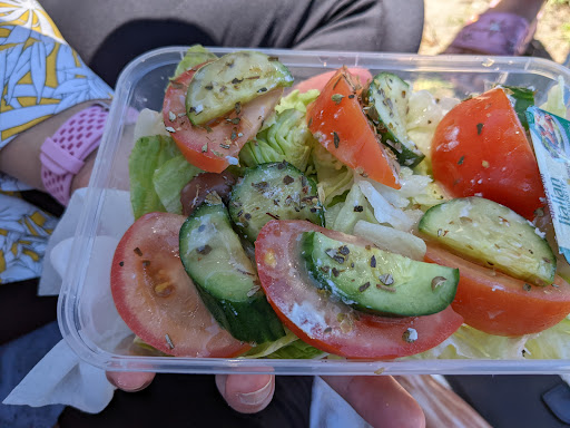 We paid $10 for this container with a fraction of a lettuce, half a tomato, a touch of cucumber, a few olives and feta pieces..