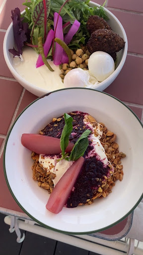 I really loved the chickpea breakfast bowl with three falafel, green tahini smeared on the bottom, topped with poached eggs, mixed leaves, pickles and yoghurt. It was so refreshing and a great healthy breakfast choice.