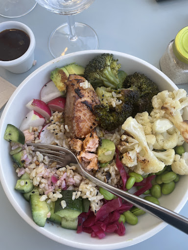 The fit out is nice with is pastel peach table tiles, big umbrellas and bright white tables and it all feels very welcoming. Itâs a casual affair where you grab your table, order off a QR reader and food is delivered to you. Keep in mind it is really popular and busy at the moment.